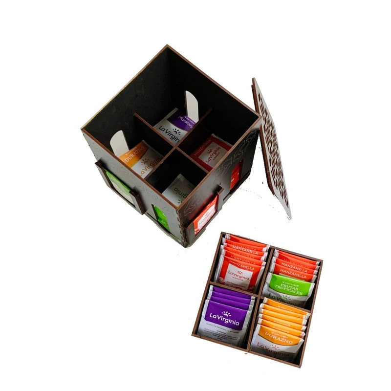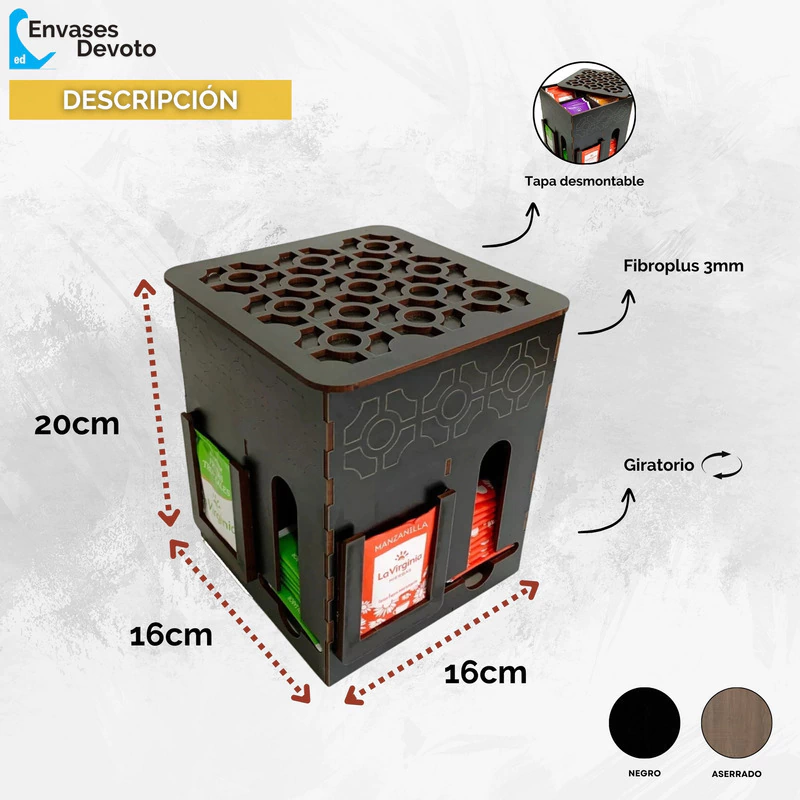 La Caja De Te Giratoria En Madera 4 Divisiones Super Moderna de la marca Envases Devoto es el complemento perfecto para organizar y exhibir tus variedades de té de manera elegante y funcional. Con sus 8 compartimentos, podrás almacenar y tener a mano tus infusiones favoritas, manteniéndolas siempre frescas y listas para disfrutar. Su diseño en forma de cubo giratorio permite un fácil acceso a cada compartimento, facilitando la selección de tu té preferido en cualquier momento.