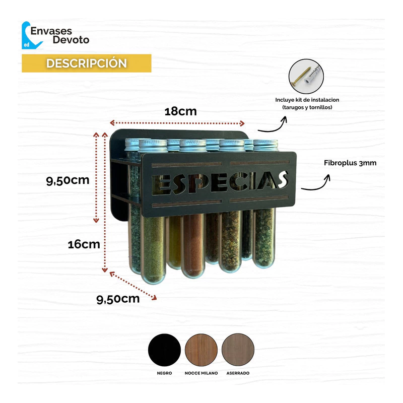 Nuestro especiero condimentero de pared con 8 frascos es el complemento perfecto para tu cocina. Con su diseño moderno y funcional, podrás tener tus especias favoritas siempre a mano y organizadas. Fabricado con materiales de alta calidad, este especiero cuenta con una estructura de madera resistente y duradera. Los frascos para especias incluidos tienen una capacidad de 40 mL cada uno, ideales para almacenar tus condimentos preferidos. Además, su sistema de colocación en la pared te permite ahorrar espacio en tu cocina y tener todo a la vista. ¡No pierdas la oportunidad de tener este práctico especiero en tu hogar!