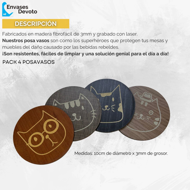 Ofrecemos varios modelos distintos con colores surtidos. Actualmente, cada pack de compra incluye 4 posavasos del modelo seleccionado.