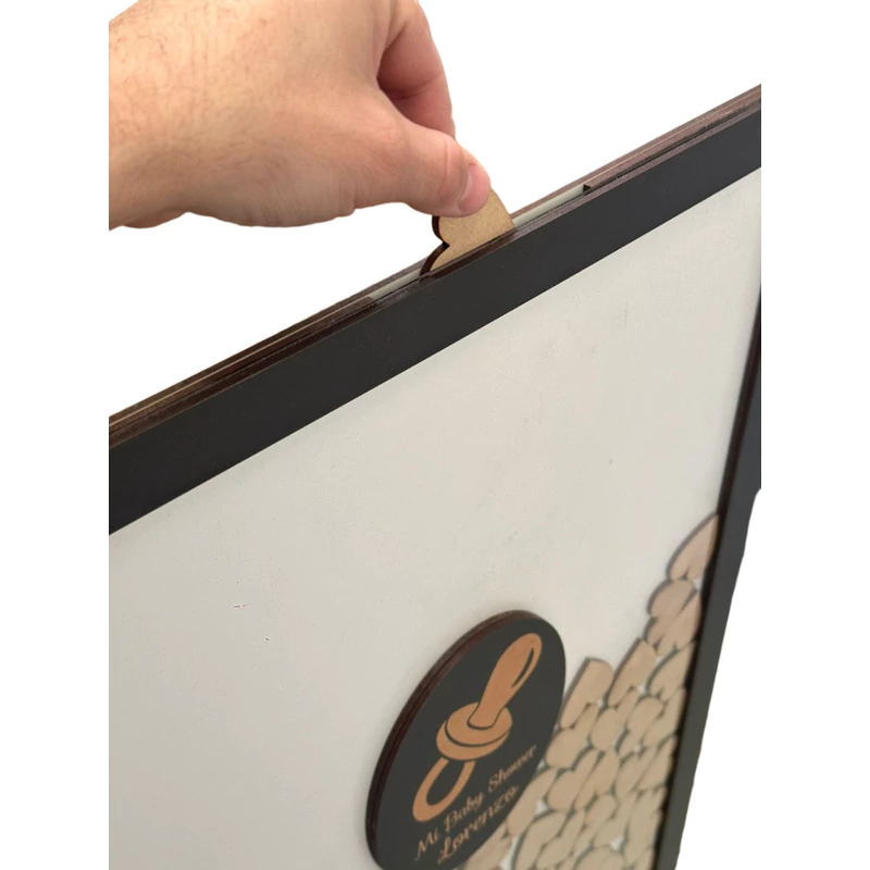 El cuadro de firmas incluye un atril para que quede parado y una canasta para almacenar las fichas, ambos en el mismo color que el marco del cuadro.